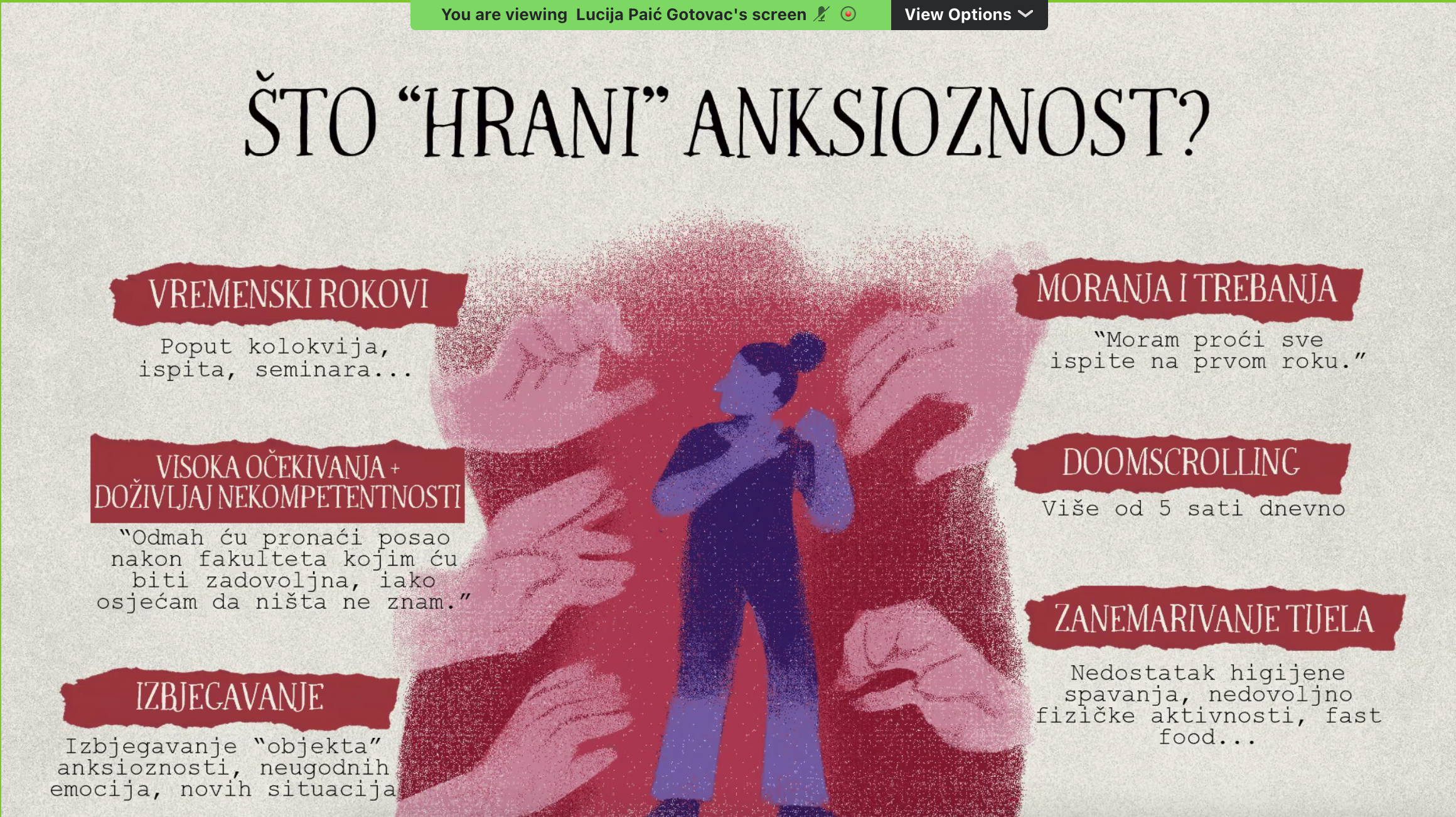 U utorak, 30. ožujka, održano je novo online predavanje iz UniSport Health ciklusa pod nazivom „Mislim, dakle overthinkam – Kako se nositi s anksioznošću?“, koje je okupilo brojne studente zainteresirane za bolje razumijevanje vlastitog mentalnog zdravlja.